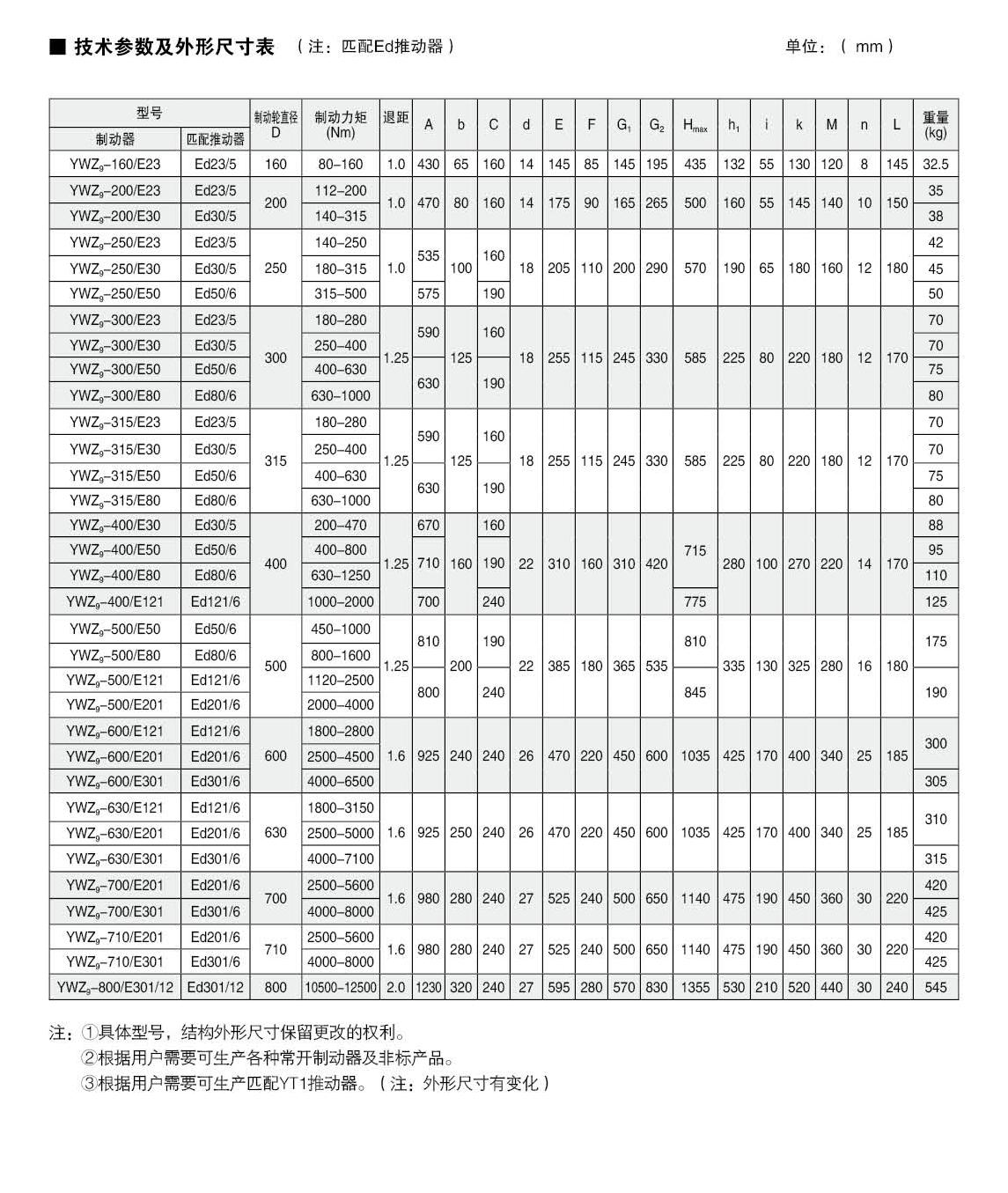 YWZ5系列電力液壓鼓式制動器的連接尺寸和制動力矩參數(shù)符合GB6333-86標(biāo)準(zhǔn),技術(shù)要求符合JB / T6406-2006標(biāo)準(zhǔn),配套符合DIN15430標(biāo)準(zhǔn)的Ed系列推動器。